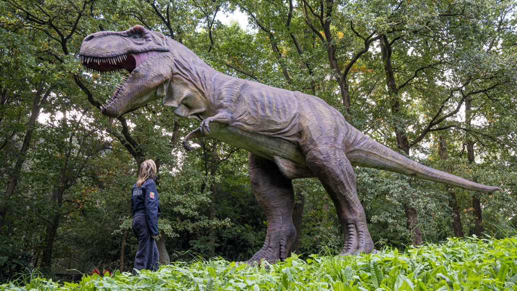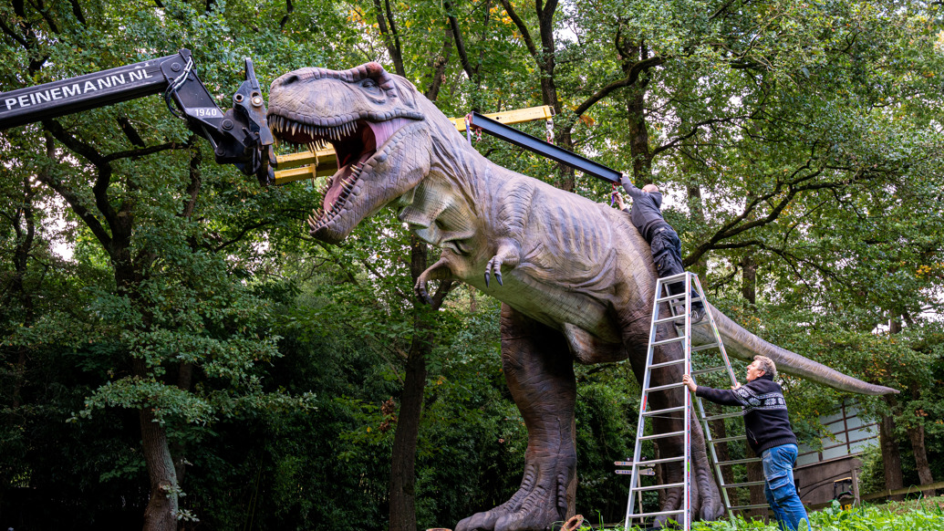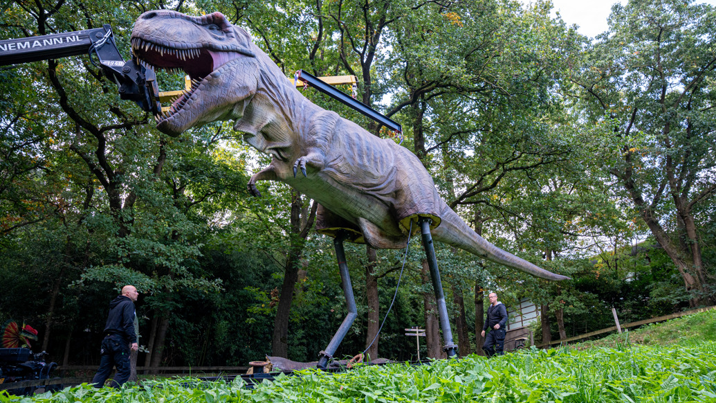 Die Mitarbeiter des Burgers’ Zoo platzieren diese Woche mehr als 20 gigantische Dinosaurier-Figuren an verschiedenen Stellen im ganzen Tierpark. Der größte Eyecatcher ist ein zehn Meter langer, fast vier Meter hoher Tyrannosaurus rex. Der Oberkörper des Riesen wurde am Donnerstag, den 25. September, von Mitarbeitern des Zoos und der Firma World of Dino BV mit schwerem Gerät in Position gebracht und montiert. Ein Kraftakt zur finalen Vorbereitung einer neuen Veranstaltung: „Dinos im Zoo“ wird am Samstag, den 27. September, eröffnet und läuft bis Dienstag, den 4.